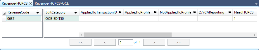 - Add the value 0637 to the source column RevenueCode, and then, add the value OCE-EDIT50 to the target column EditCategory and the value 1 to NeedHCPCS . You can also copy this row from the sample crosswalk file Revenue-HCPCS-OCE located at %ECRootPath%\STANDARDS\HIPAA\Crosswalks\ClinicalEdits\Samples\CMS_OCE.