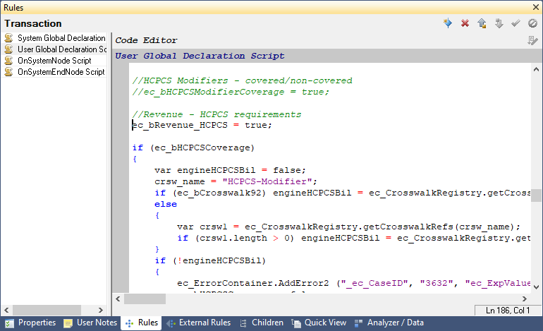 - On the Rules tab, click User Global declaration Script and in the code uncomment the following line, and then save the guideline: